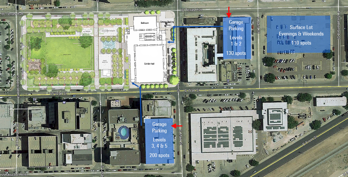 From Big Spring Street in downtown Midland, turn east onto Texas Avenue. Go 3 blocks east to Main Street. Turn right (south) on Main Street and follow signs to load in area. See map below. The 20 foot wide load in area allows vendors to exit Main Street and easily and safely unload and reload their event related items. Please contact BCC staff for with questions or after hour deliveries. BCC has no loading dock. We have a forklift on site to assist with loading and unloading.